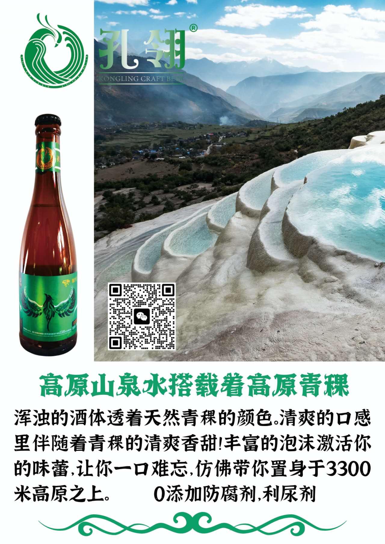 孔翎品牌专注于健康饮食的开发及推广。青藏高原食材(高原青稞,高原山泉水,喜马拉雅松木、高原蜂蜜、高原玫瑰、藏红花、红景天等)为基础食材的酿造啤酒。NFC非浓缩还原果汁等。